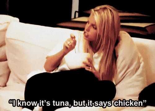 Canned tuna fish or tuna salad. You should see the face I’m making even THINKING about this disgusting “food.” It makes me feel physically ill to be around. I am so NOT a tinned fish girlie, sorry! And don’t even get me started on combining tuna and cheese, as in a melt or a casserole. Barf!!! (On the other hand, I LOVE ahi tuna, the rarer, the better.)