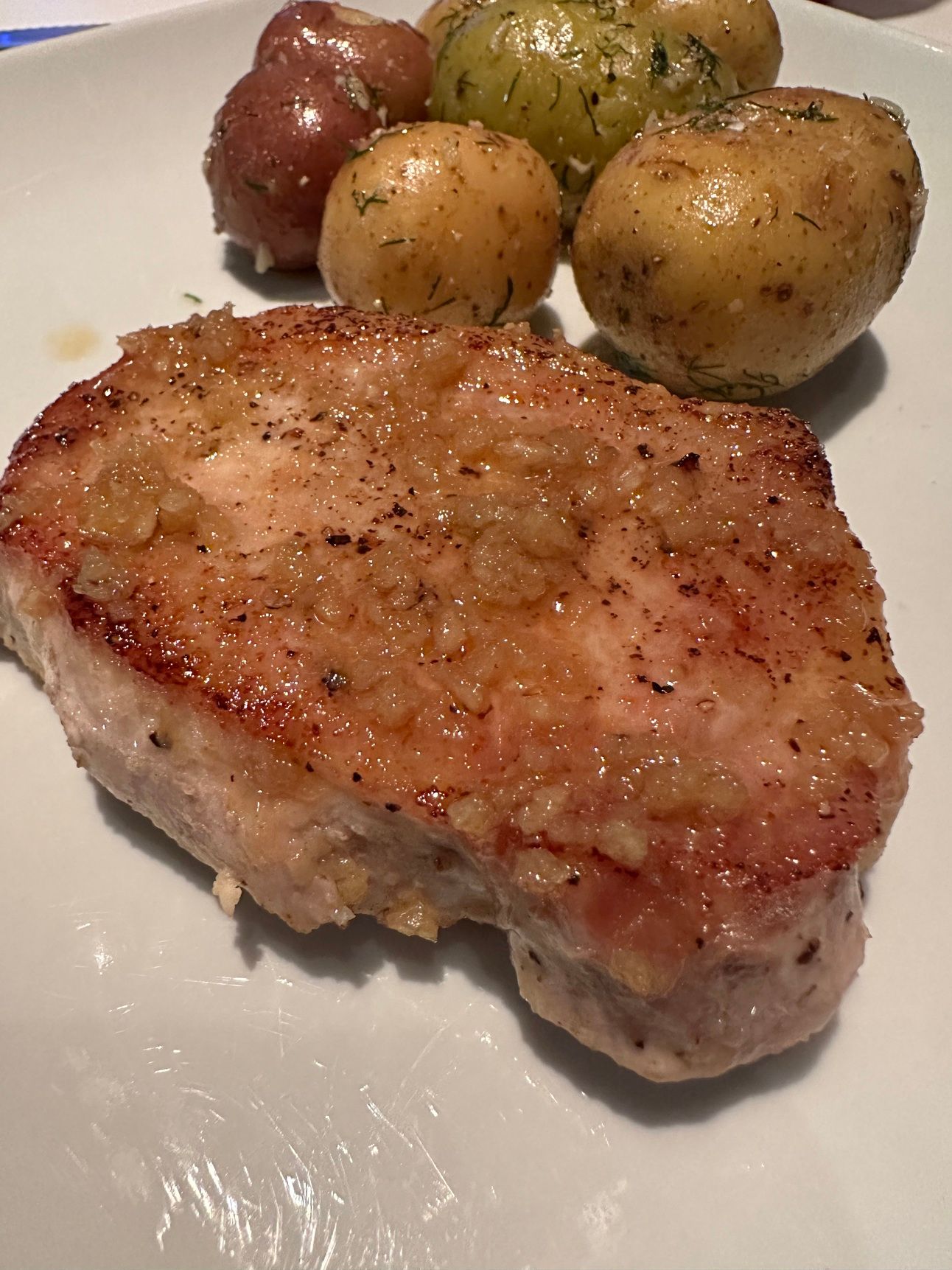 Honey garlic pork chops. Don’t you love a good pan sauce? I served these with little multicolored baby potatoes boiled and tossed with butter, salt, garlic, and fresh dill.