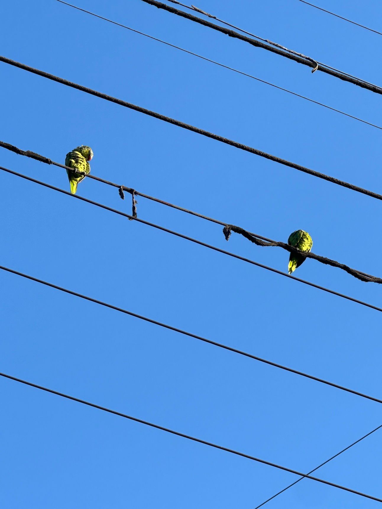And then, there are the Pasadena parrots. They’re probably my favorite birds in the neighborhood, because they’re so mysterious. They’re beautiful green parrots who make these obnoxious, squeaky noises and fly around in a pack. Here’s a picture I snapped of them outside my go-to coffee shop one morning: