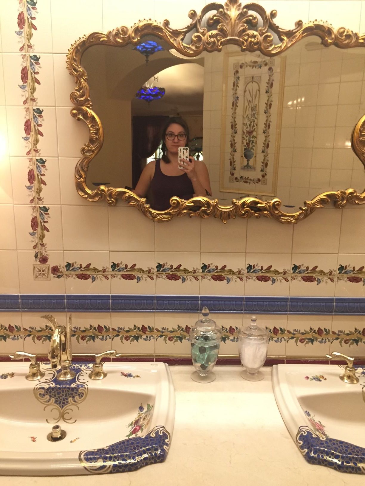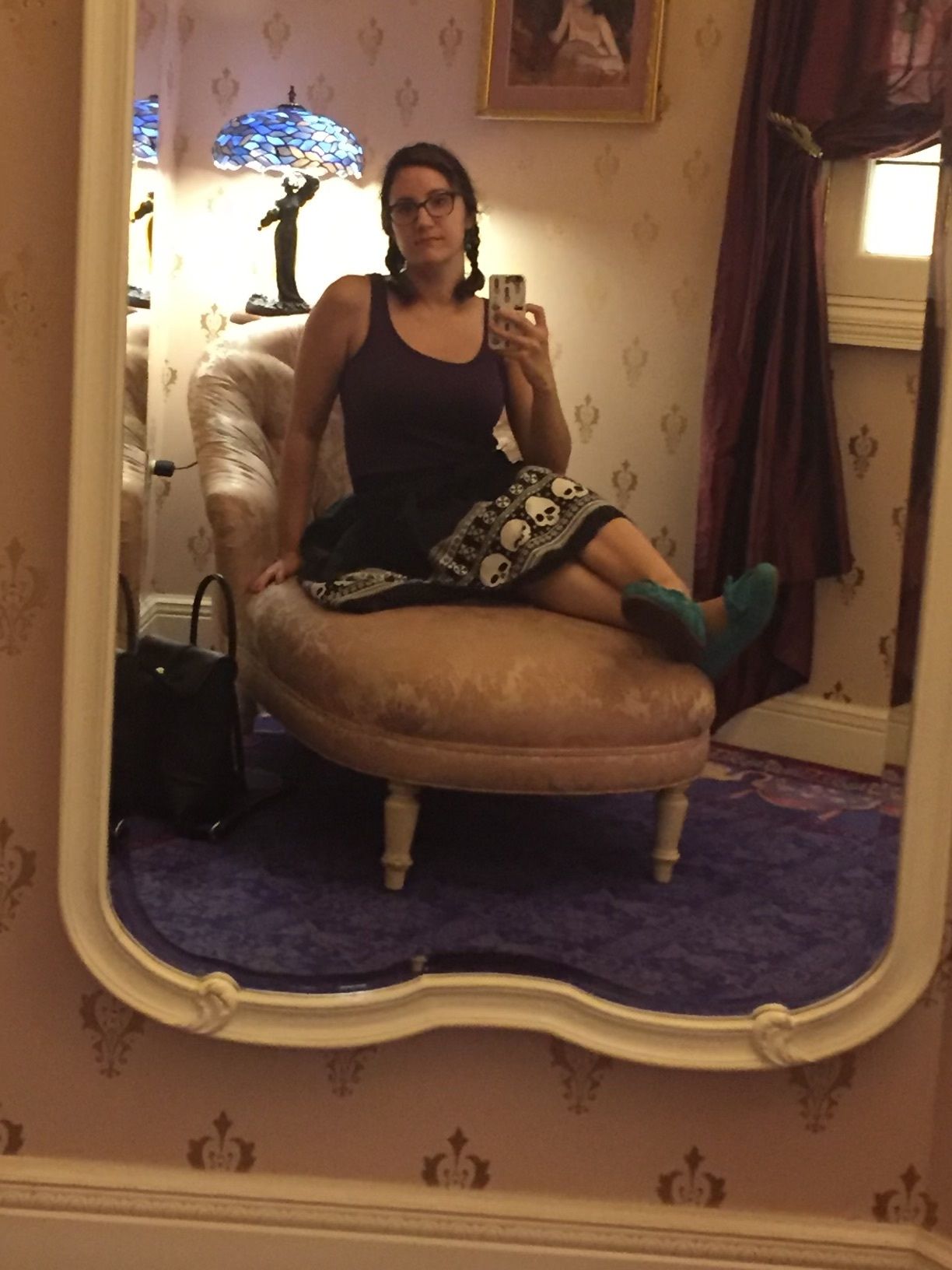 The first snag we hit was that Club 33 has a strict dress code that requires men to wear long pants and jackets. I know: who the fuck brings a formal jacket to Disneyland? Not us. Well, the men in our group both had to borrow Club 33 jackets, and the one who was wearing shorts also borrowed a pair of pants, which was pretty hilarious. While the guys were getting changed, I popped into the bathroom and did an impromptu photo shoot: